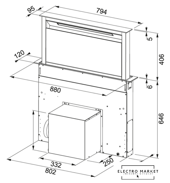 конструкция скрытая, монтаж для встраивания, ширина 120 см, управление дистанционное, производительность вытяжки 631 м³/ч, цвет нержавеющая сталь