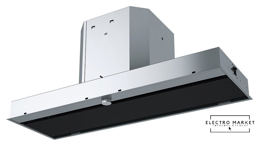 конструкция коробчатая, монтаж островной, ширина 90 см, управление электронное/кнопочное, производительность вытяжки 555 м³/ч, цвет черный/нержавеющая сталь