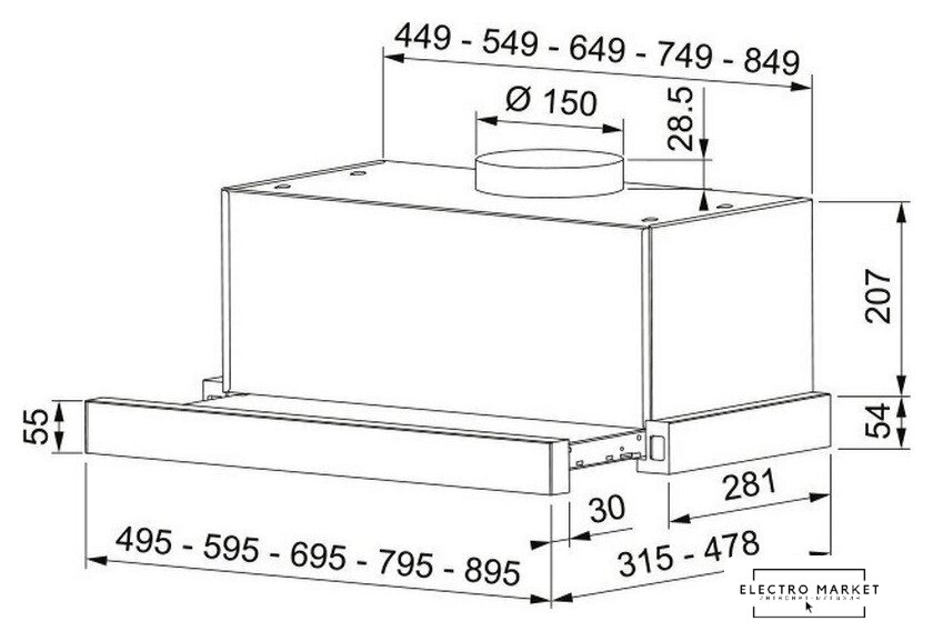 конструкция телескопическая, монтаж для встраивания, ширина 59.8 см, управление механическое/кнопочное, производительность вытяжки 336 м³/ч, производительность мотора 650 м³/ч, цвет серый/черный