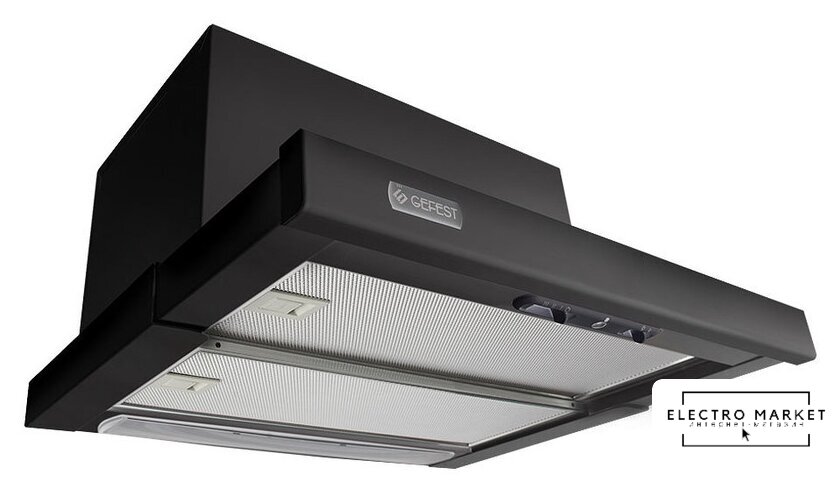 конструкция наклонная, монтаж настенный, ширина 59.5 см, управление механическое/кнопочное, производительность вытяжки 1100 м³/ч, цвет черный