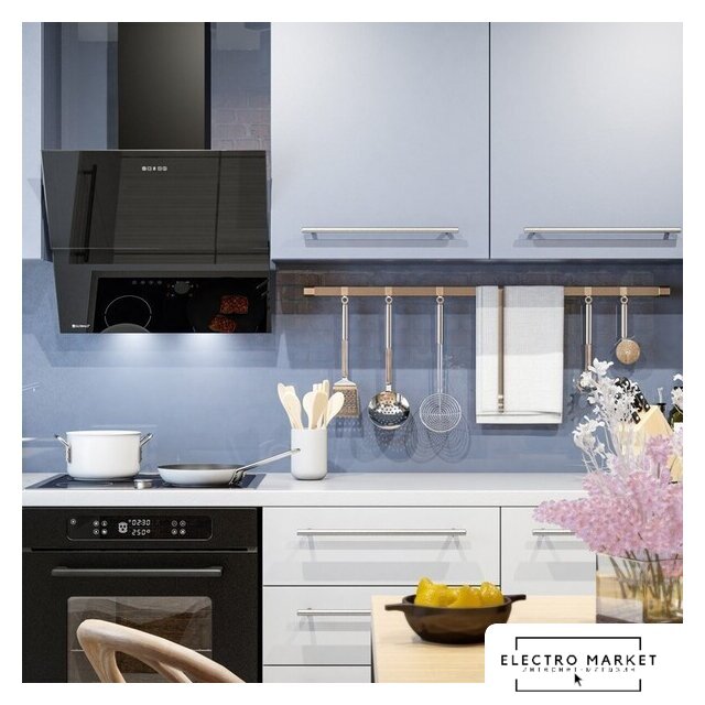 конструкция наклонная, монтаж настенный, ширина 89.5 см, управление сенсорное, производительность вытяжки 590 м³/ч, цвет черный