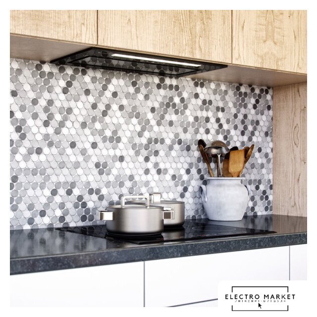 конструкция скрытая, монтаж для встраивания, ширина 71.2 см, управление электронное/кнопочное, производительность вытяжки 591 м³/ч, цвет нержавеющая сталь/черный