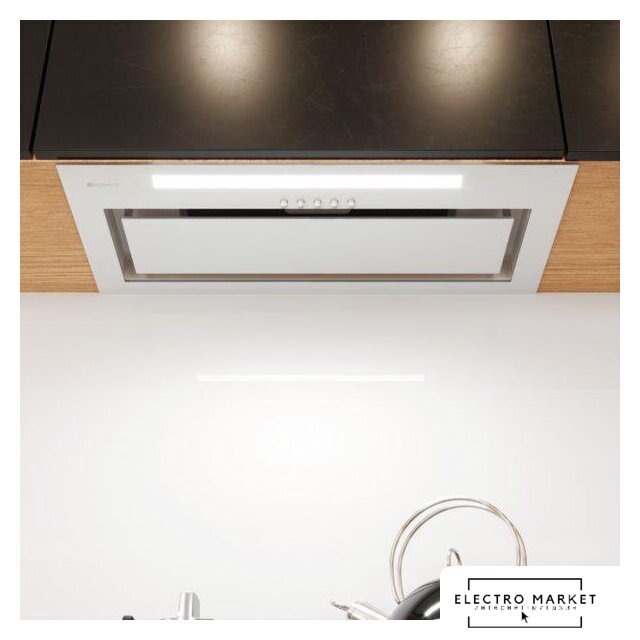 конструкция коробчатая, монтаж островной, ширина 38 см, управление механическое/кнопочное, производительность мотора 1000 м³/ч, цвет белый