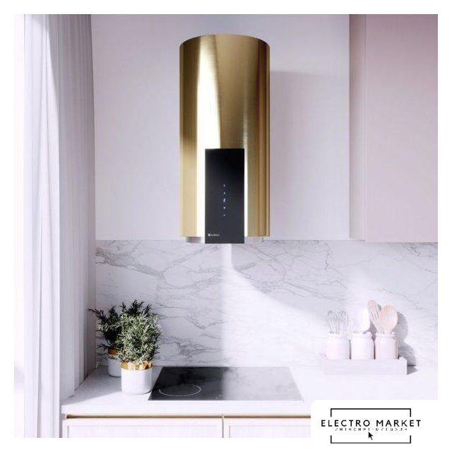 конструкция коробчатая, монтаж островной, ширина 39 см, управление электронное/кнопочное, производительность вытяжки 365 м³/ч, цвет золотой