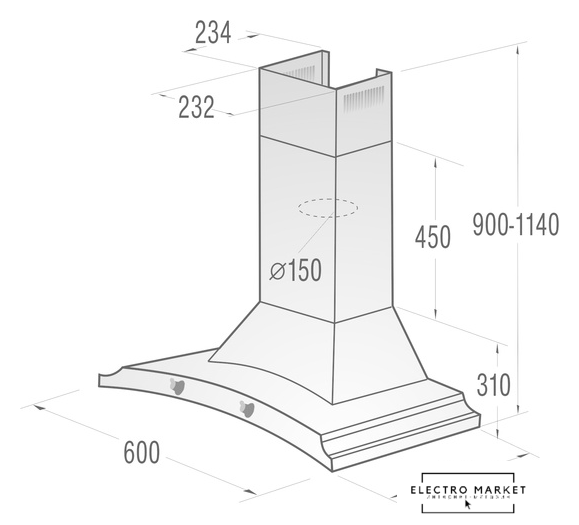 конструкция коробчатая, монтаж островной, ширина 40 см, управление электронное/кнопочное, производительность мотора 1150 м³/ч, цвет черный