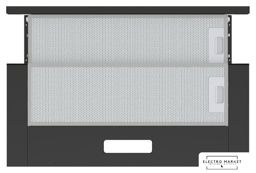 конструкция скрытая, монтаж для встраивания, ширина 53 см, управление кнопочное, производительность мотора 1100 м³/ч, цвет нержавеющая сталь/черный