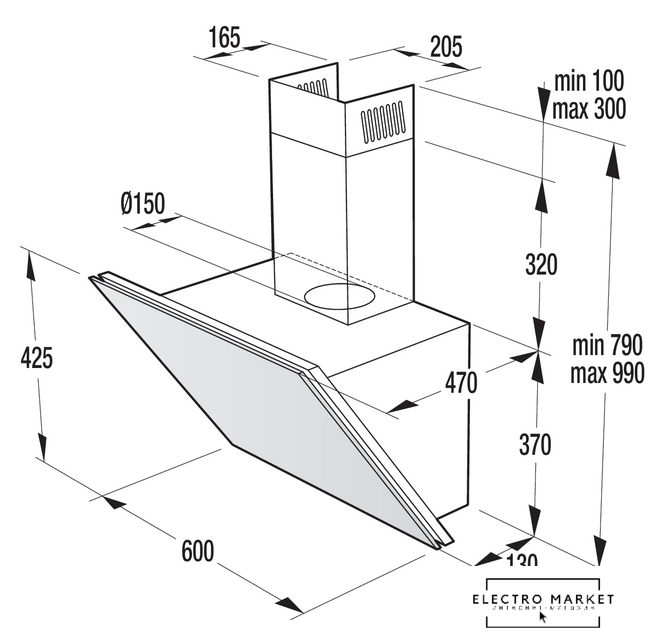 конструкция наклонная, монтаж настенный, ширина 60 см, управление сенсорное, производительность вытяжки 515 м³/ч, цвет черный