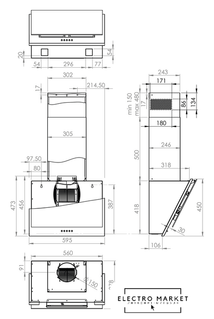 конструкция скрытая, монтаж настенный/для встраивания, ширина 77 см, управление электронное/кнопочное, производительность вытяжки 580 м³/ч, цвет белый/черный