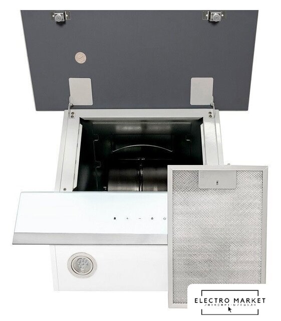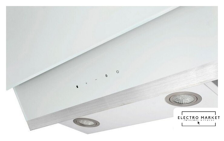 конструкция наклонная, монтаж настенный, ширина 49.6 см, управление механическое/кнопочное, производительность мотора 715 м³/ч, цвет белый
