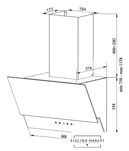 конструкция наклонная, монтаж настенный, ширина 60 см, управление механическое/кнопочное, производительность мотора 900 м³/ч, цвет черный