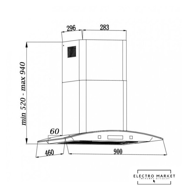 конструкция Т-образная, монтаж настенный, управление механическое/кнопочное, производительность мотора 430 м³/ч, ширина 60 см