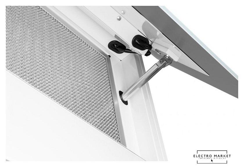 конструкция скрытая, монтаж для встраивания, ширина 59.8 см, управление механическое/поворотный переключатель, производительность мотора 850 м³/ч, цвет белый
