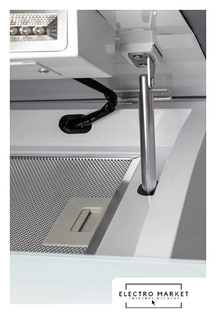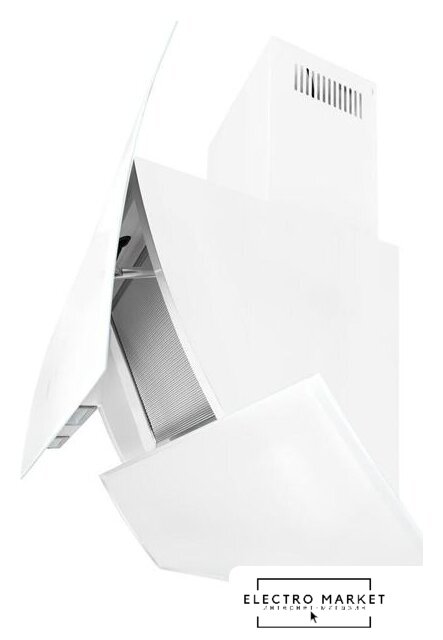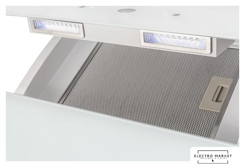 конструкция Т-образная, монтаж настенный, ширина 59 см, управление сенсорное, производительность мотора 1000 м³/ч, цвет нержавеющая сталь/белый