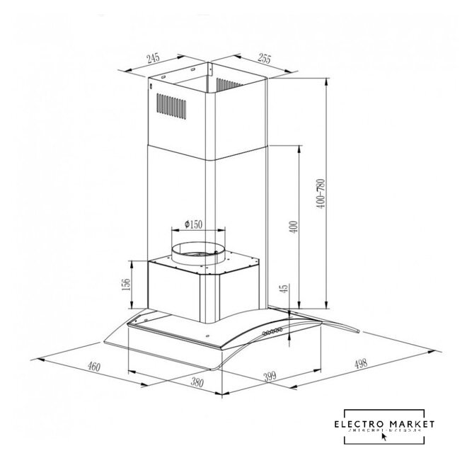 конструкция скрытая, монтаж для встраивания, ширина 52 см, управление механическое/кнопочное, производительность мотора 850 м³/ч, цвет нержавеющая сталь