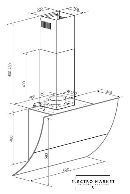 конструкция наклонная, монтаж настенный, ширина 59.8 см, управление сенсорное, производительность мотора 1200 м³/ч, цвет черный