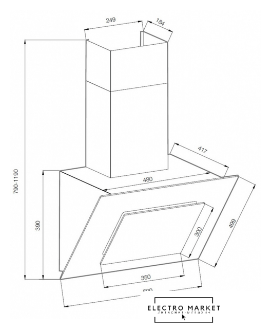 конструкция скрытая, монтаж для встраивания, ширина 71.4 см, управление электронное/кнопочное, производительность вытяжки 580 м³/ч, производительность мотора 1050 м³/ч, цвет черный