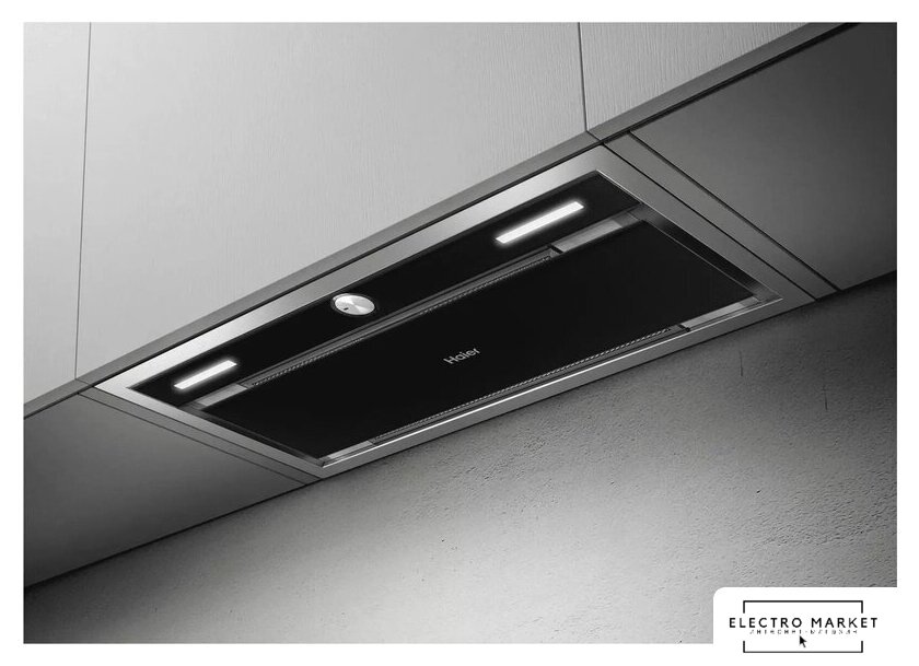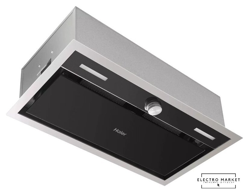 конструкция скрытая, монтаж для встраивания, ширина 52 см, управление сенсорное/жестами, производительность мотора 900 м³/ч, цвет черный