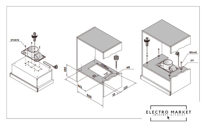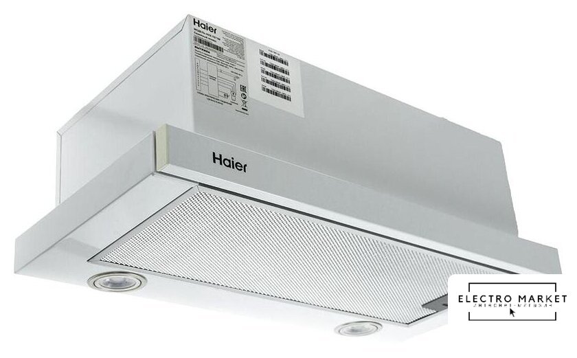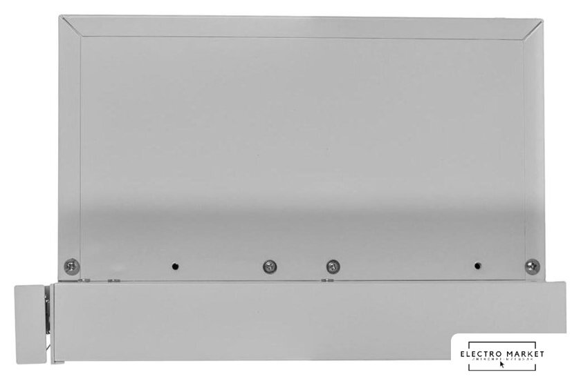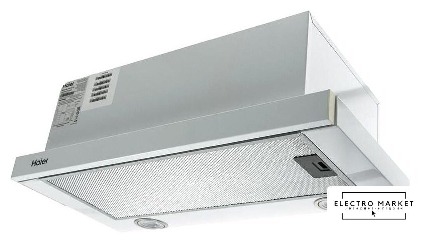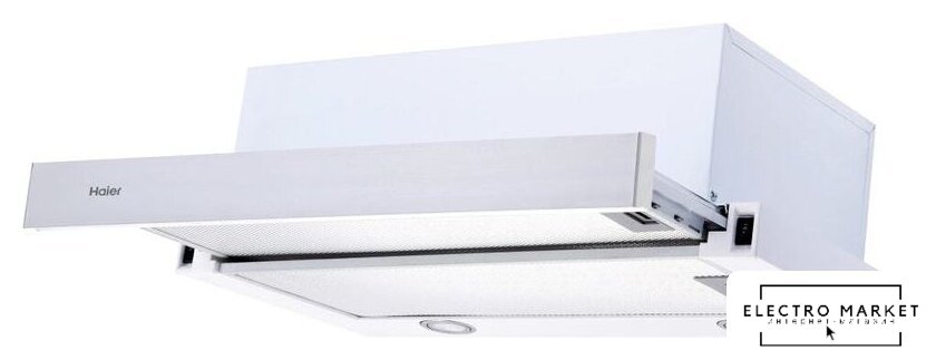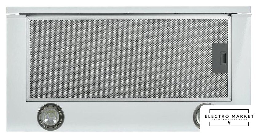 конструкция телескопическая, монтаж для встраивания, ширина 59.8 см, управление механическое/кнопочное, производительность мотора 670 м³/ч, цвет белый/серый