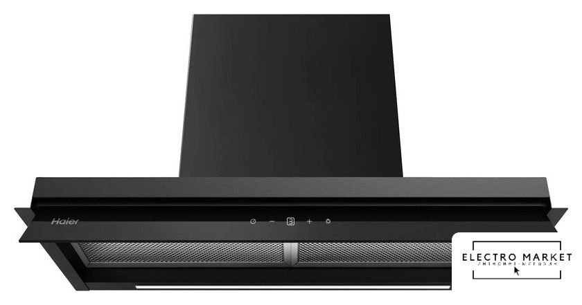 конструкция наклонная, монтаж настенный, ширина 90 см, управление сенсорное, производительность мотора 1000 м³/ч, цвет черный