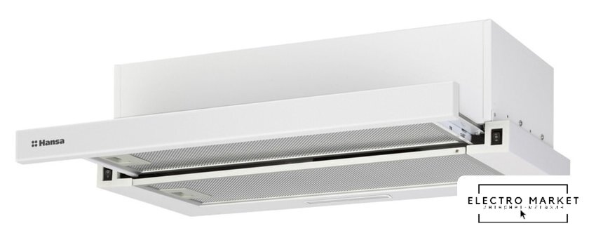 конструкция телескопическая, монтаж для встраивания, ширина 49.8 см, управление механическое/кнопочное, производительность мотора 550 м³/ч, цвет белый