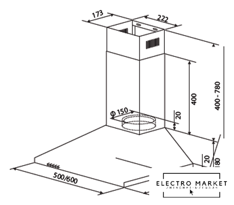 конструкция наклонная, монтаж настенный, ширина 59.5 см, управление механическое/кнопочное, производительность мотора 600 м³/ч, цвет черный