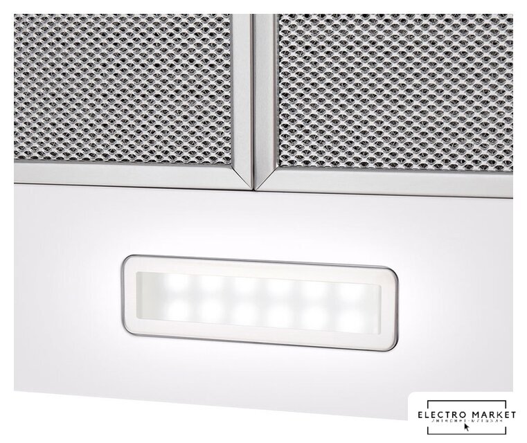 конструкция скрытая, монтаж для встраивания, ширина 52.5 см, управление механическое/кнопочное, производительность мотора 1050 м³/ч, цвет нержавеющая сталь