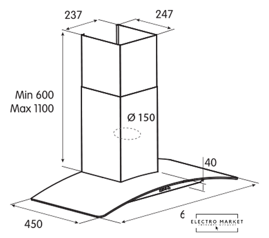 конструкция коробчатая, монтаж настенный, ширина 40 см, управление электронное/кнопочное, производительность мотора 750 м³/ч, цвет черный