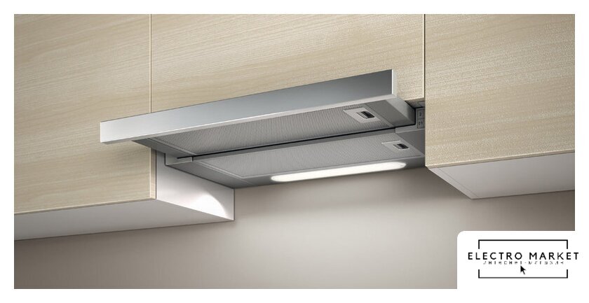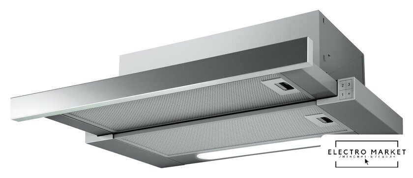 конструкция скрытая, монтаж для встраивания, ширина 52.2 см, управление механическое/слайдерное, производительность вытяжки 580 м³/ч, цвет нержавеющая сталь