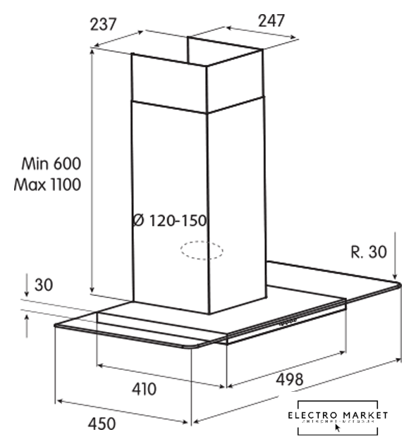 конструкция Т-образная, монтаж настенный, ширина 60 см, управление механическое/кнопочное, производительность мотора 700 м³/ч, цвет нержавеющая сталь