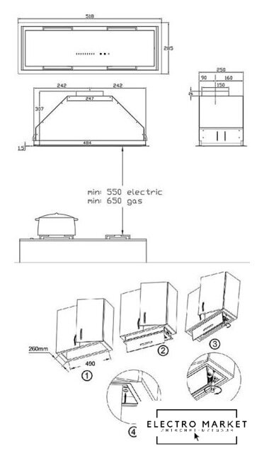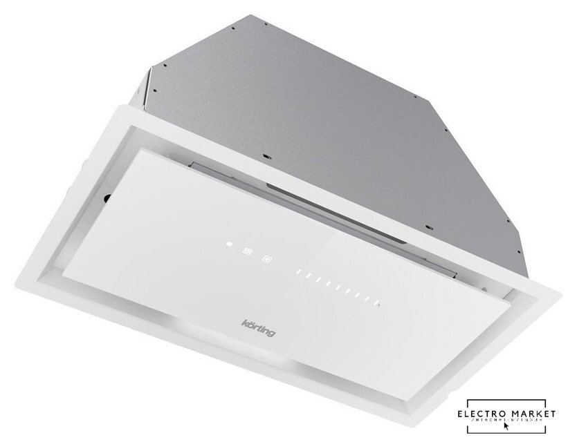 конструкция скрытая, монтаж для встраивания, ширина 71.4 см, управление электронное/кнопочное, производительность вытяжки 550 м³/ч, производительность мотора 1050 м³/ч, цвет белый