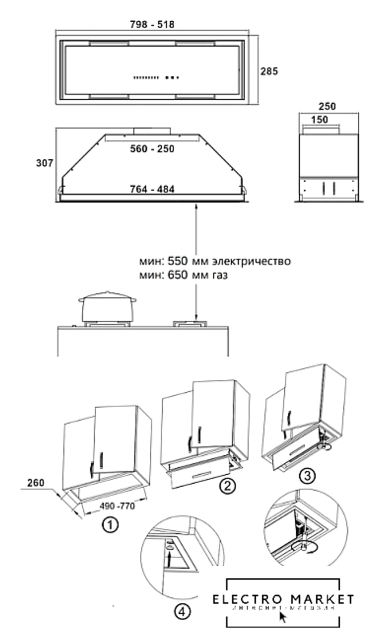 конструкция скрытая, монтаж для встраивания, ширина 71.4 см, управление электронное/кнопочное, производительность вытяжки 550 м³/ч, производительность мотора 1050 м³/ч, цвет черный