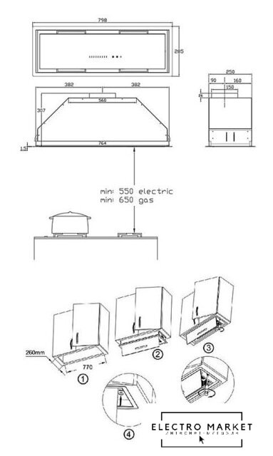 конструкция наклонная, монтаж настенный, ширина 59.7 см, управление электронное/поворотный переключатель, производительность мотора 830 м³/ч, цвет белый