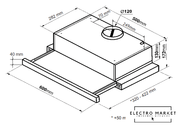 конструкция телескопическая, монтаж для встраивания, ширина 49.8 см, управление механическое/кнопочное, производительность вытяжки 336 м³/ч, производительность мотора 650 м³/ч, цвет нержавеющая сталь/серый