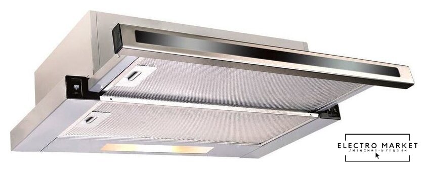 конструкция скрытая, монтаж для встраивания, ширина 59.8 см, управление механическое/кнопочное, производительность мотора 1050 м³/ч, цвет нержавеющая сталь