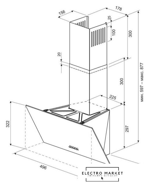 конструкция наклонная, монтаж настенный, ширина 59.5 см, управление сенсорное, производительность мотора 750 м³/ч, цвет черный