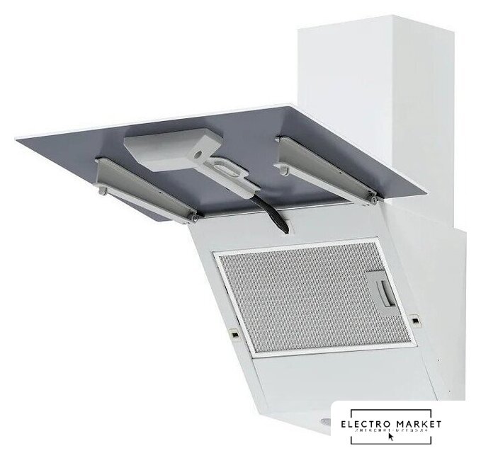 конструкция наклонная, монтаж настенный, ширина 49 см, управление механическое/кнопочное, производительность мотора 430 м³/ч, цвет белый