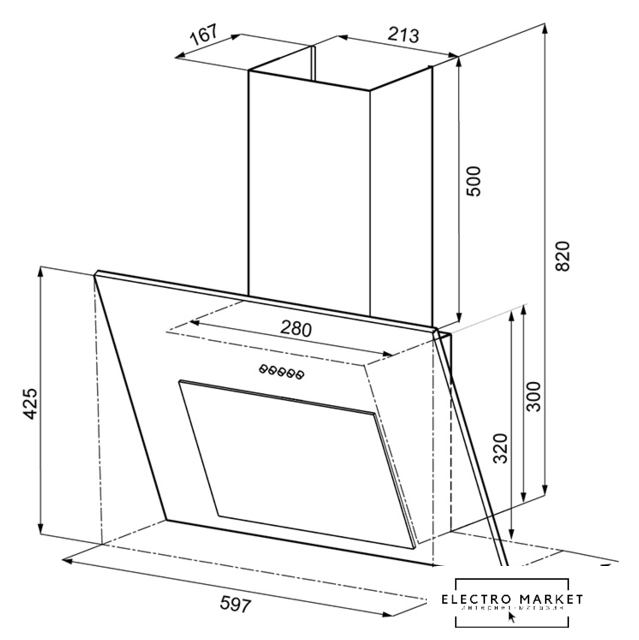 конструкция наклонная, монтаж настенный, ширина 59.5 см, управление механическое/кнопочное, производительность мотора 1100 м³/ч, цвет черный