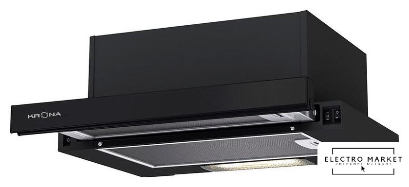 конструкция телескопическая, монтаж для встраивания, ширина 60 см, управление механическое/слайдерное, производительность мотора 650 м³/ч, цвет нержавеющая сталь/черный