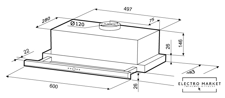 конструкция скрытая, монтаж для встраивания, ширина 73.5 см, управление механическое/кнопочное, производительность мотора 750 м³/ч, цвет нержавеющая сталь