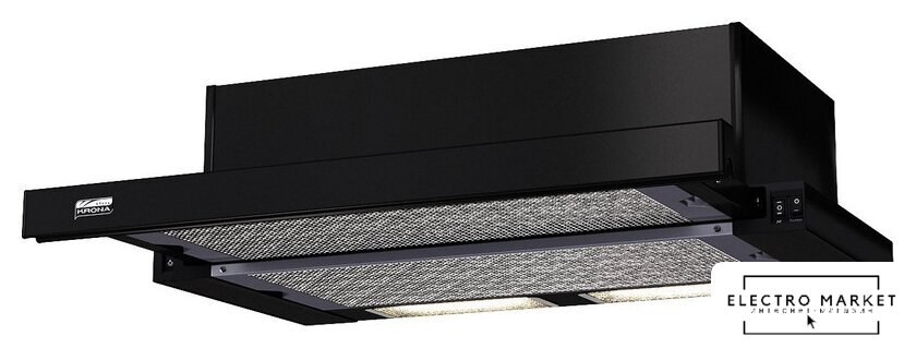 конструкция наклонная, монтаж настенный, ширина 60 см, управление электронное/кнопочное, производительность вытяжки 550 м³/ч, цвет черный