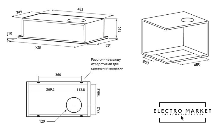 конструкция скрытая, монтаж для встраивания, ширина 52 см, управление механическое/кнопочное, производительность мотора 850 м³/ч, цвет белый