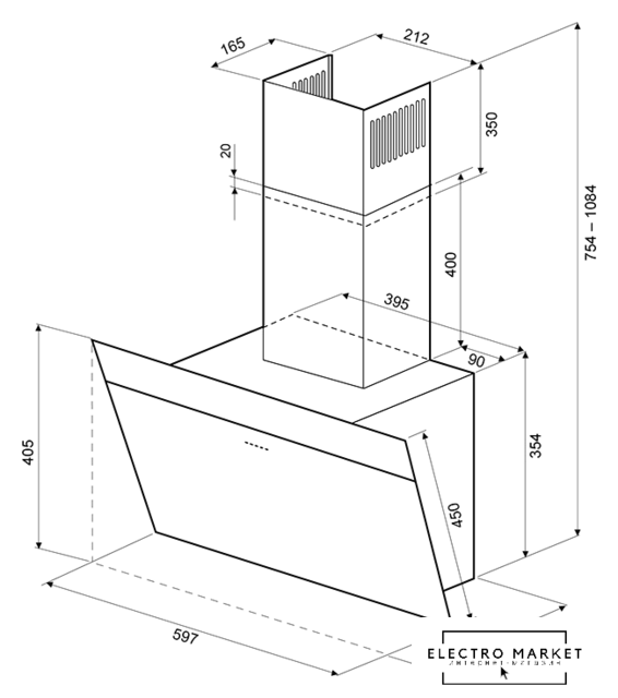 конструкция наклонная, монтаж настенный, ширина 89.5 см, управление сенсорное, цвет черный/нержавеющая сталь