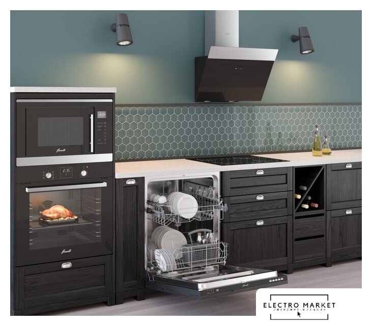 конструкция скрытая, монтаж для встраивания, ширина 79.5 см, управление механическое/кнопочное, производительность мотора 950 м³/ч, цвет черный