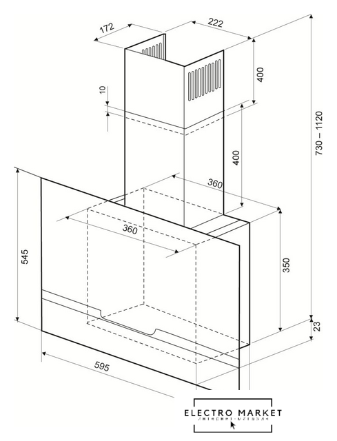 конструкция Т-образная, монтаж настенный, ширина 89.8 см, управление сенсорное, производительность мотора 800 м³/ч, цвет черный