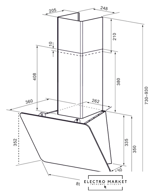 конструкция наклонная, монтаж настенный, ширина 59.5 см, управление сенсорное, производительность мотора 850 м³/ч, цвет белый