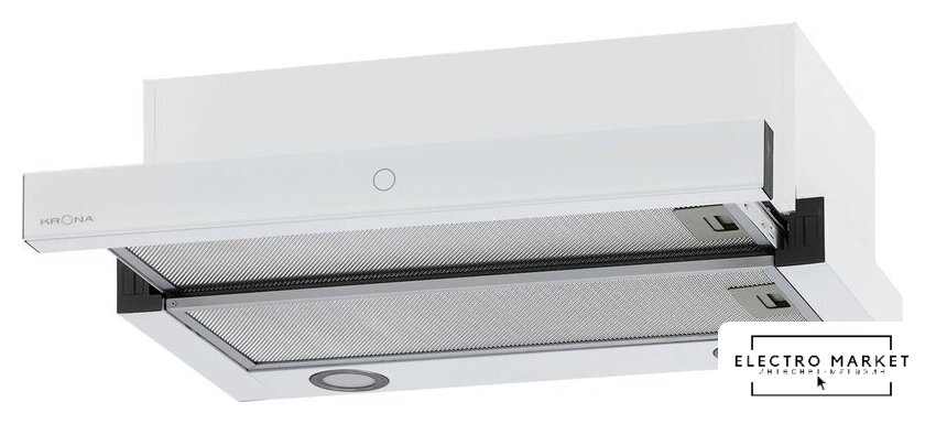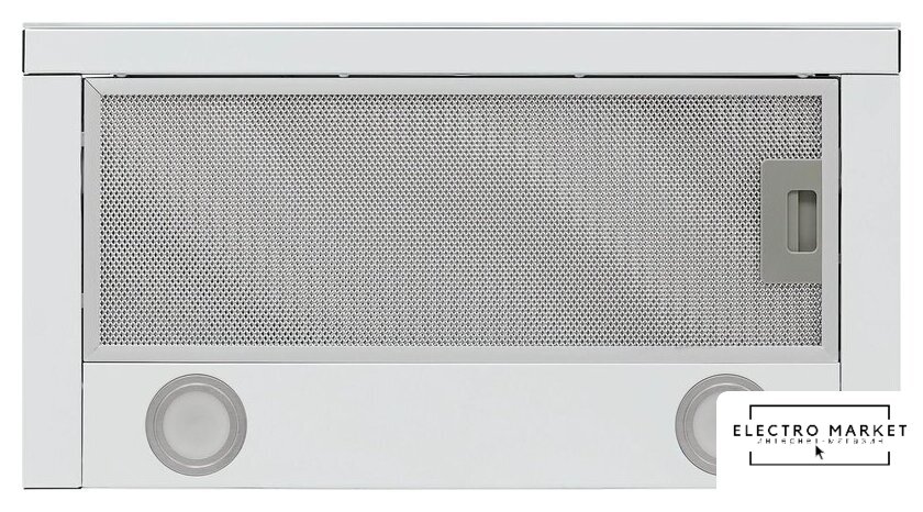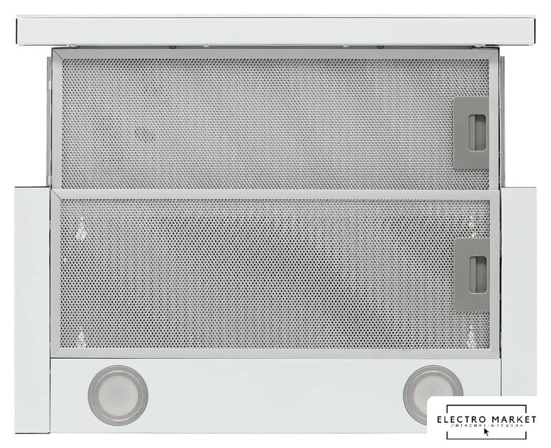 конструкция телескопическая, монтаж для встраивания, ширина 59.8 см, управление механическое/кнопочное, производительность вытяжки 650 м³/ч, цвет белый