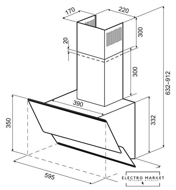 конструкция наклонная, монтаж настенный, управление сенсорное, производительность мотора 900 м³/ч, ширина 60 см