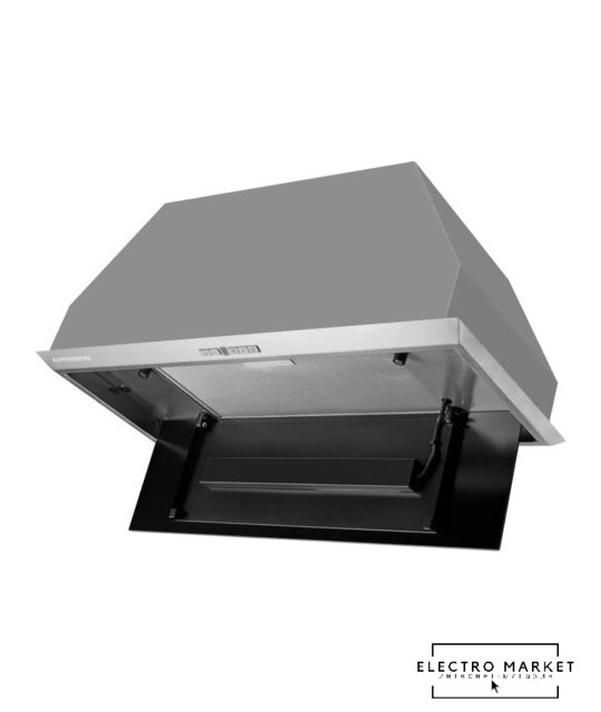 конструкция телескопическая, монтаж настенный, ширина 59.8 см, управление механическое/кнопочное, производительность вытяжки 400 м³/ч, производительность мотора 1000 м³/ч, цвет черный