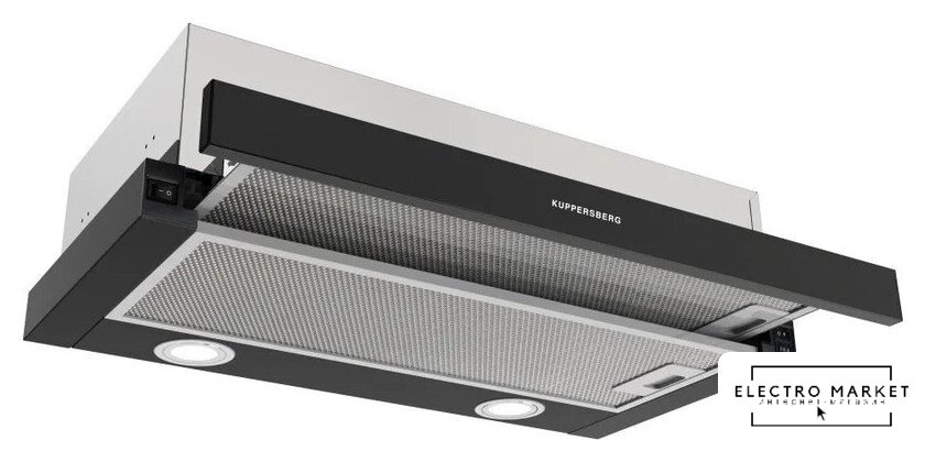 конструкция телескопическая, монтаж для встраивания, ширина 60 см, управление механическое/кнопочное, производительность мотора 400 м³/ч, цвет нержавеющая сталь/черный