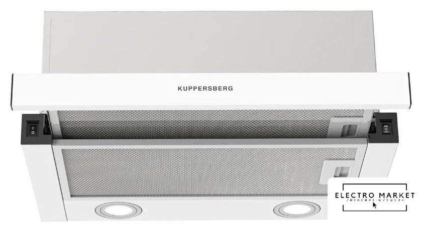 конструкция телескопическая, монтаж для встраивания, ширина 59.8 см, управление механическое/кнопочное, производительность мотора 650 м³/ч, цвет нержавеющая сталь/черный